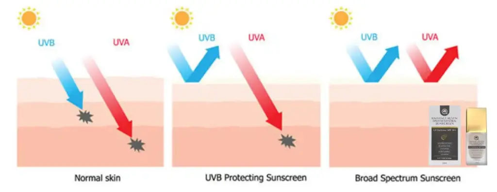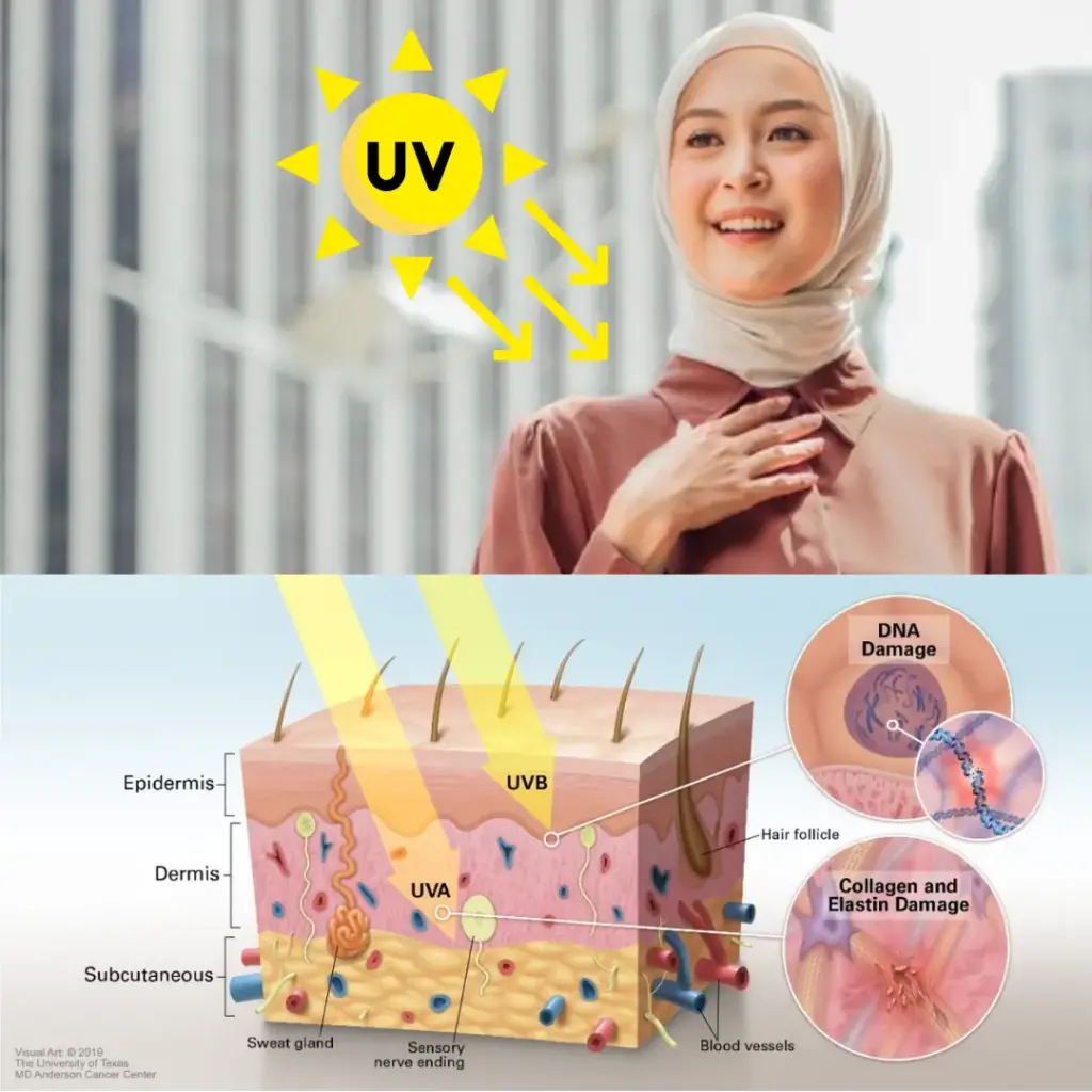 ⚠️Cahaya UVB, akan sampai ke lapisan atas kulit. Sinar UVB boleh menyebabkan pembakaran, keradangan dan pigmentasi pada kulit serta meninggikan risiko kanser kulit.
